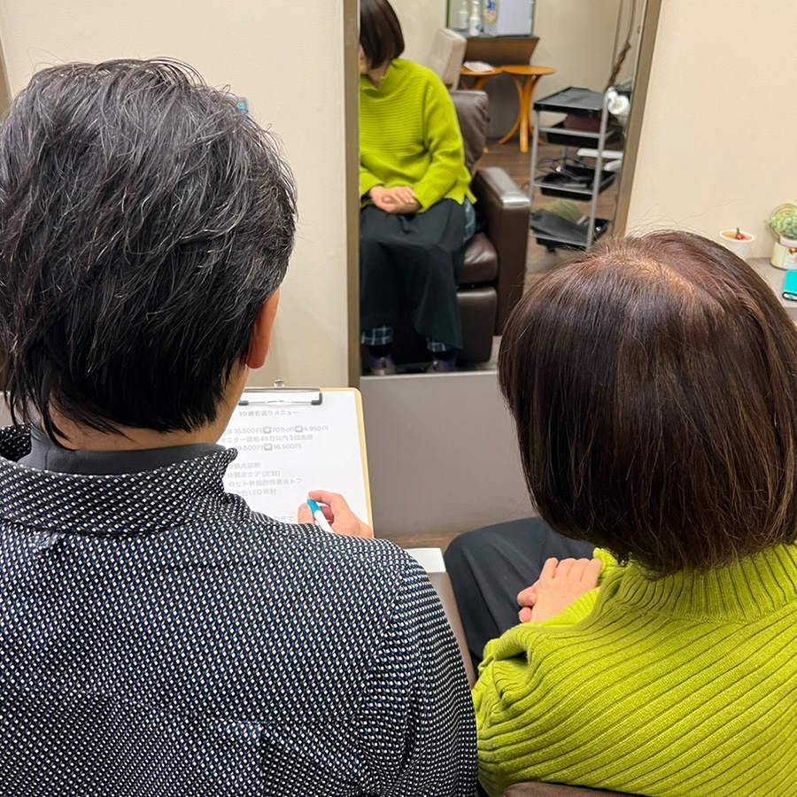 発毛のメカニズムの解説と発毛育毛コースのご説明を行い、体験者様がしっかり納得された上での安心の施術契約をしております。